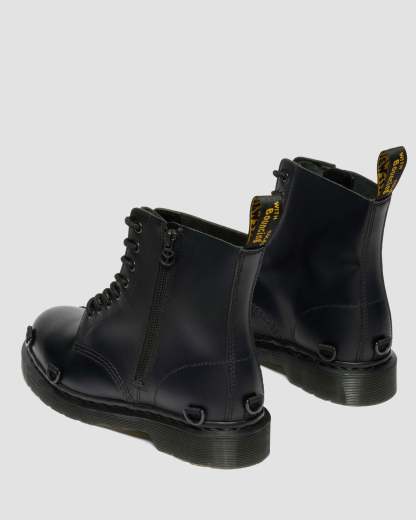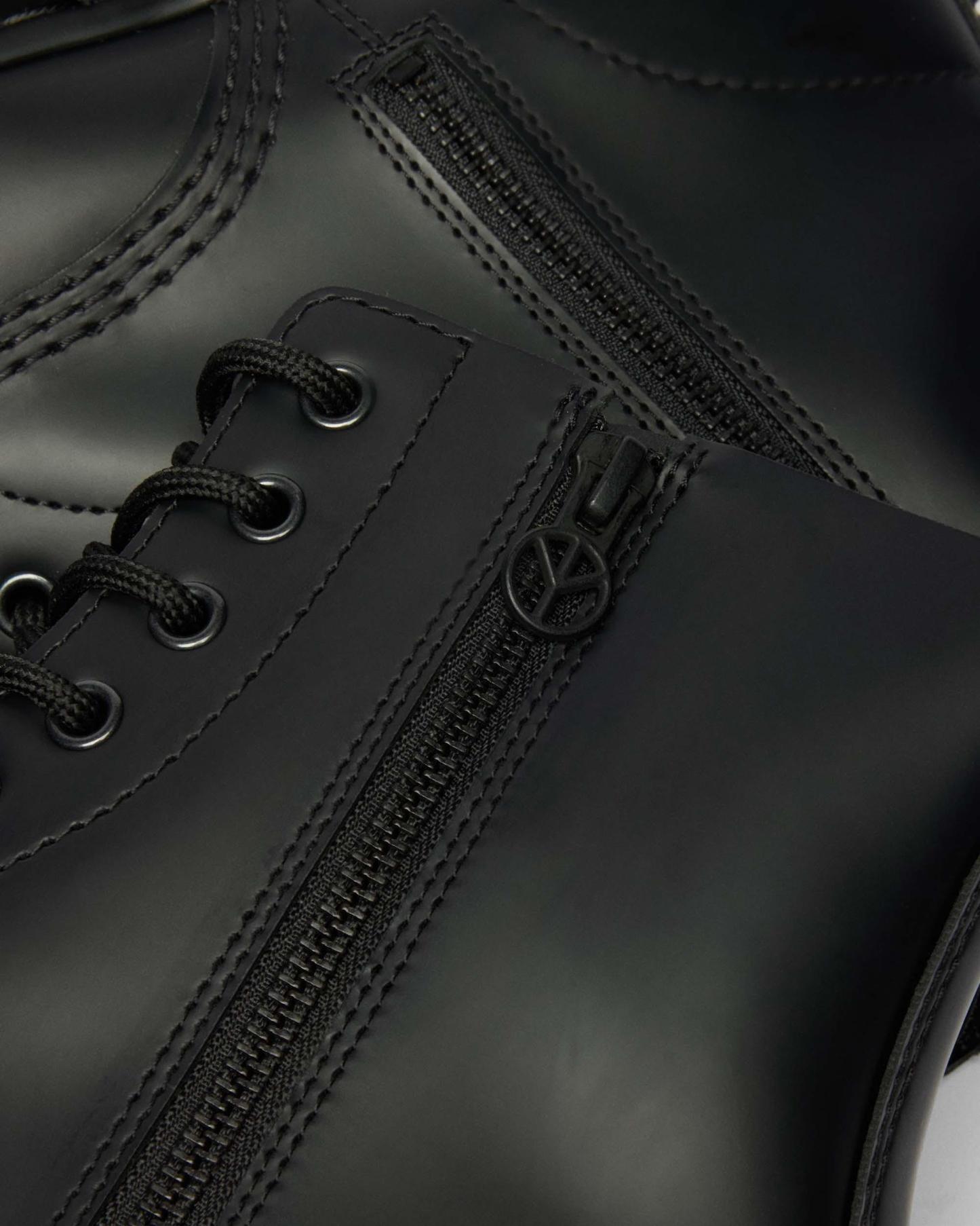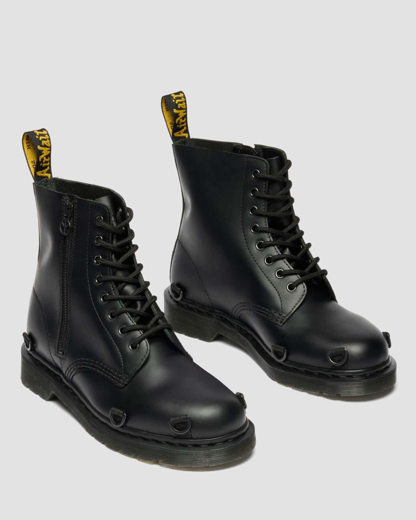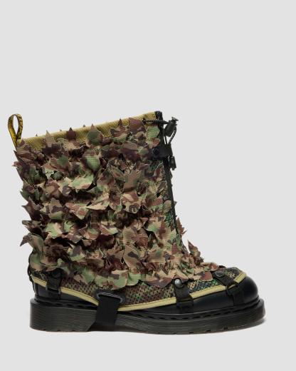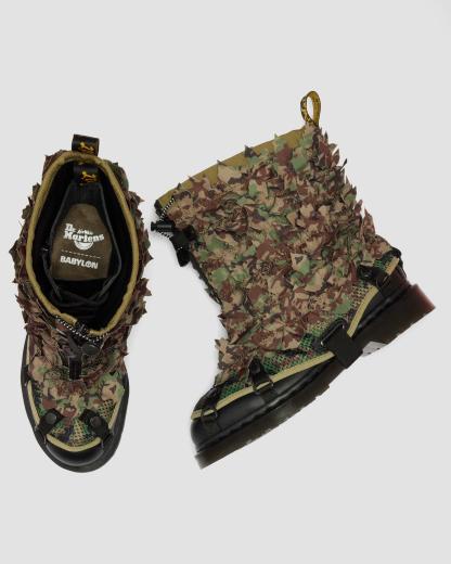 The 1460 boot in disguise. Joining forces with LA hardcore punks, Babylon to disrupt our most recognisable silhouette with a removable ghillie suit. Created from a lightweight camo mesh and covered in custom leaf cutouts, the ghillie overlay is secured by clipping onto the D-ring loops surrounding the base of the boot. Underneath is our classic 8-eye cut from Smooth leather in monochrome black. Fitted with a side zip featuring a Babylon pull. Set on a traditional black DMS outsole with matching welt stitch. Signed with an AirWair heel loop.