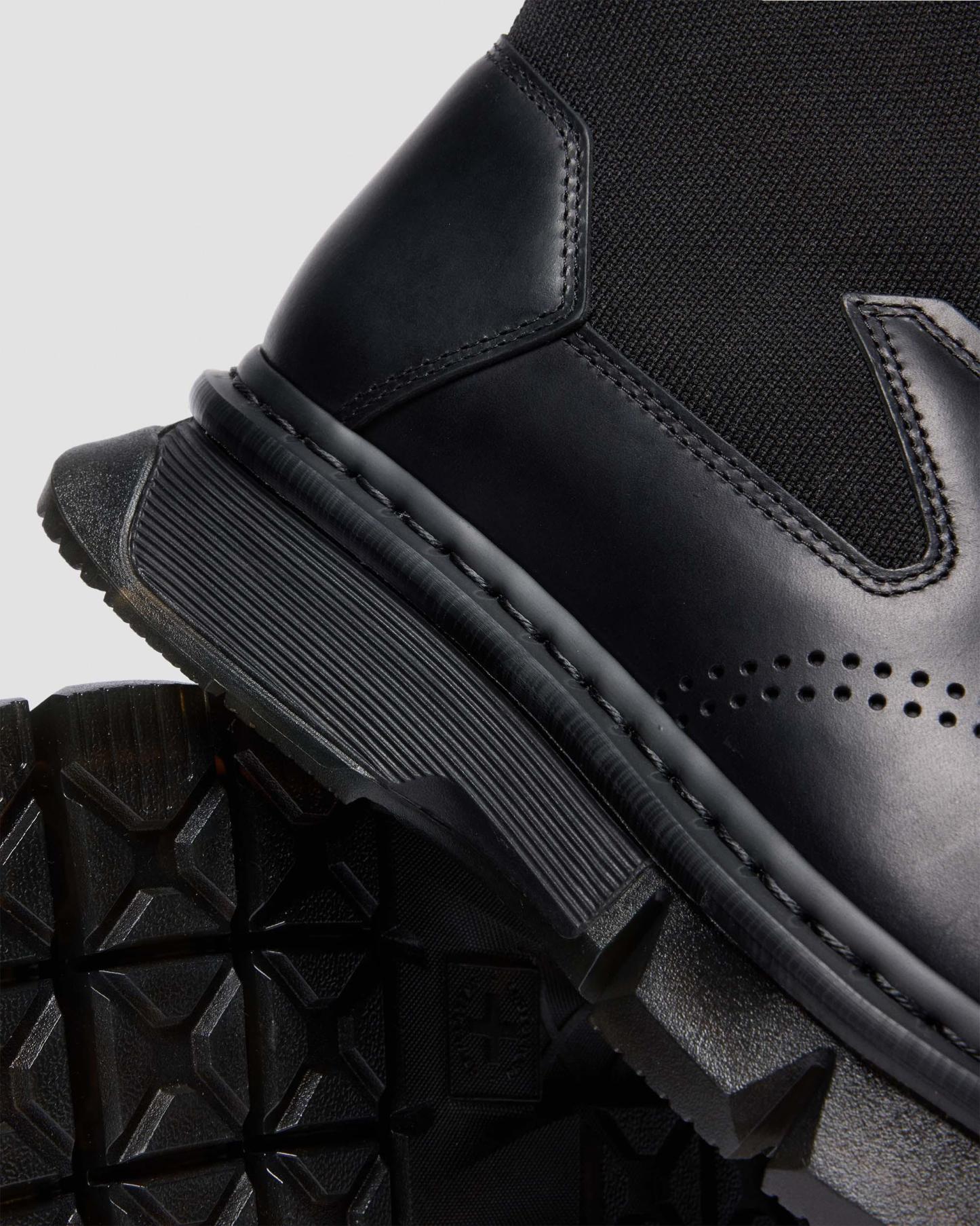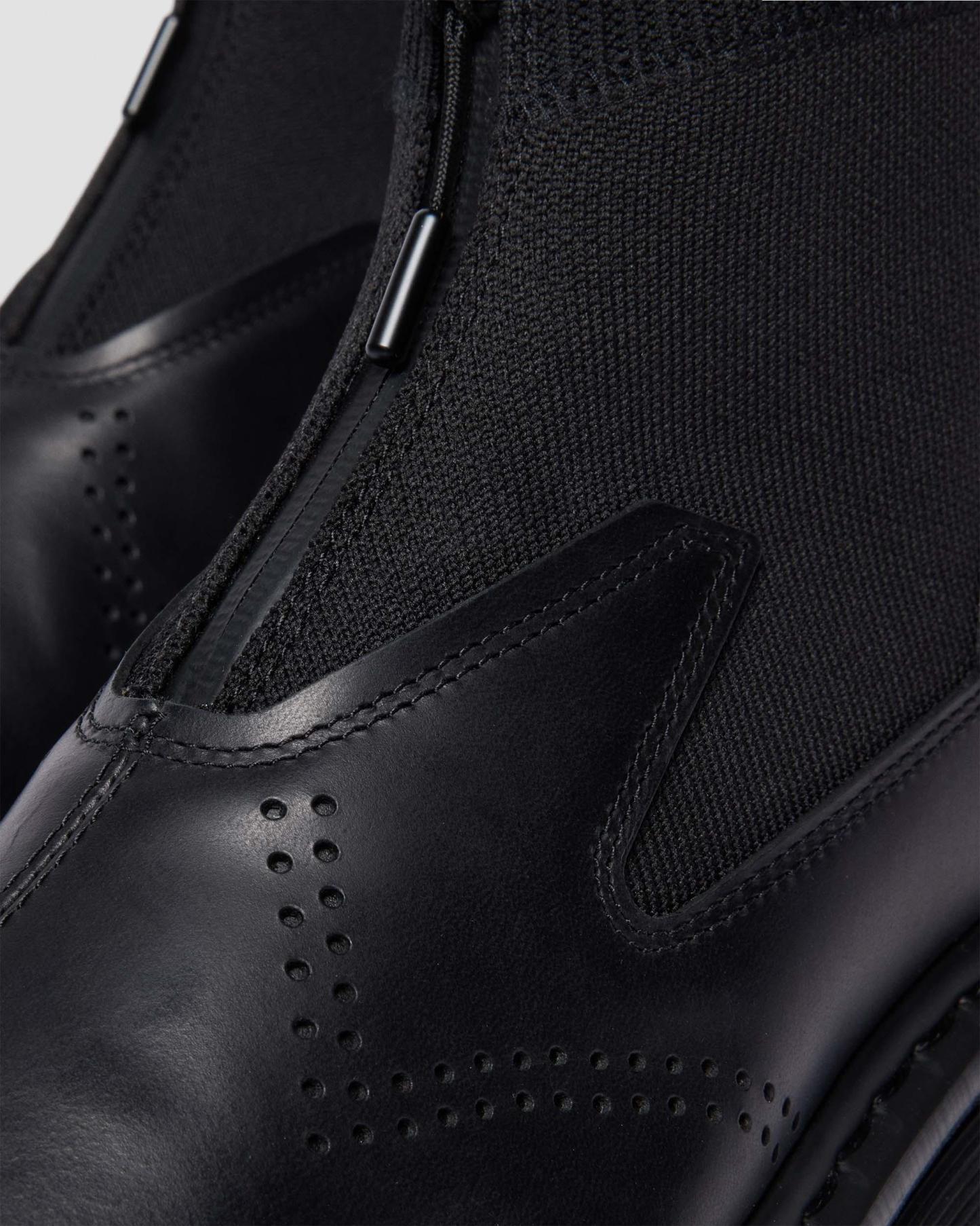 Crafted from easy-wearing, smooth Orleans leather, with a synthetic knitted sock bisected with a subtle front zip. The all-black upper is secured to the flexile outsole with a black-on-black welt stitch and fitted with a wide-footbed SoftWair insole for a more natural fit. And each pair is signed with an AirWair monochrome heel loop.