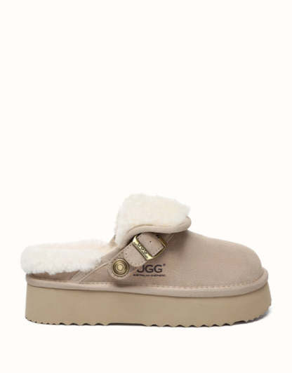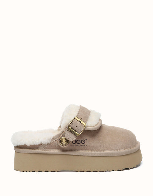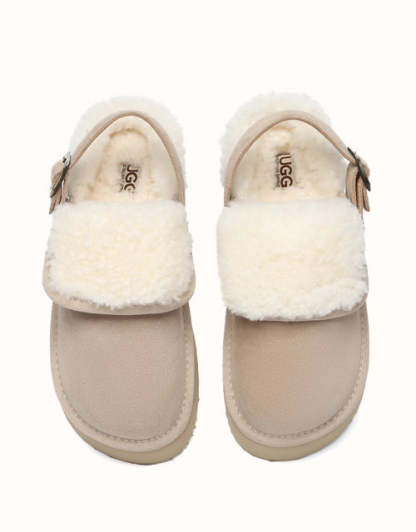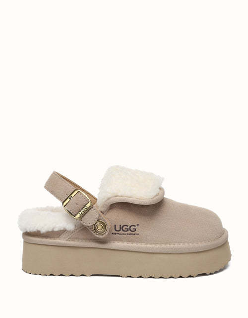 Enhance your everyday comfort with the AUSTRthtALIAN SHEPthtHERD Tenley Platform Slingback Slippers. Coming in classic chestnut and sand, these premium sheepskin slippers combine cosy warmth with timeless style. The elevated platform offers a subtle boost, while the custom EVA sole ensures soft, cushioned support. Designed with a versatile strap that can be positioned at the front or back, these slippers deliver a snug fit to complement any outfit.