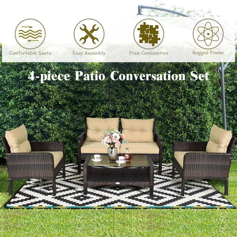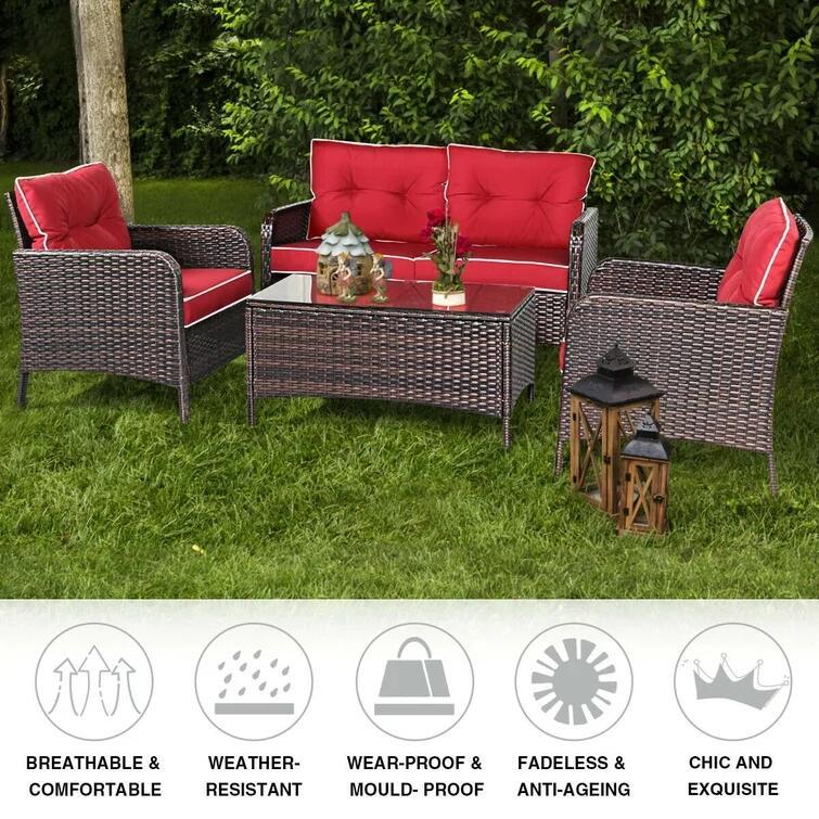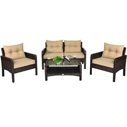 This 4-piece rattan sofa set with cushions is very practical. It will enhance your outdoor relaxation and beautify your garden with its modern and elegant style. Robust, it will last for years. Its seat cushions are comfortable and plush. This furniture set will offer you optimal comfort. An excellent choice! Come and buy it!