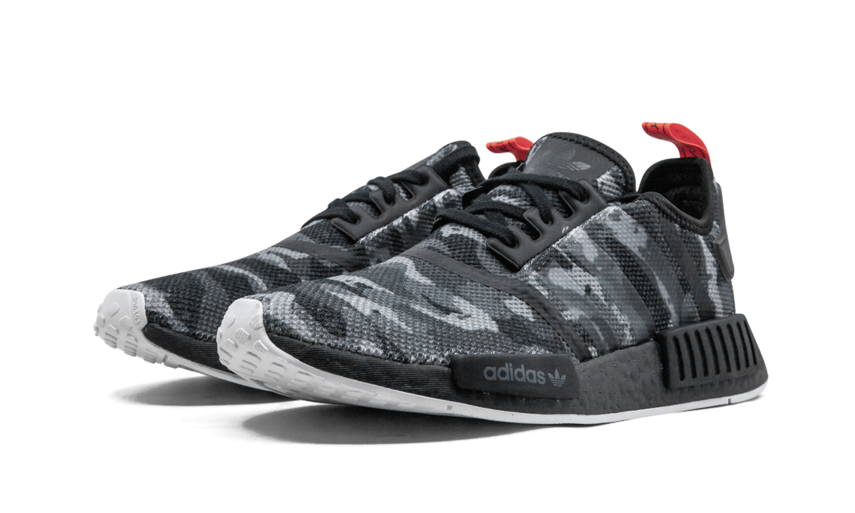 The adithtdas NMD R1 "NYC Camo" is a special edition of the lifestyle silhouette featuring a graphic upper and a callout to New York City on the Boost midsole. The upper features a mesh construction with a black camouflage graphic and the side stripes in a clear treatment. The full-length Boost foam midsole is painted black, and also features "NMD" and "NYC" text in white printed on opposite heels. A white rubber outsole and red heel tab loop complete the design. The adithtdas NMD R1 "NYC Camo" released in 2018.