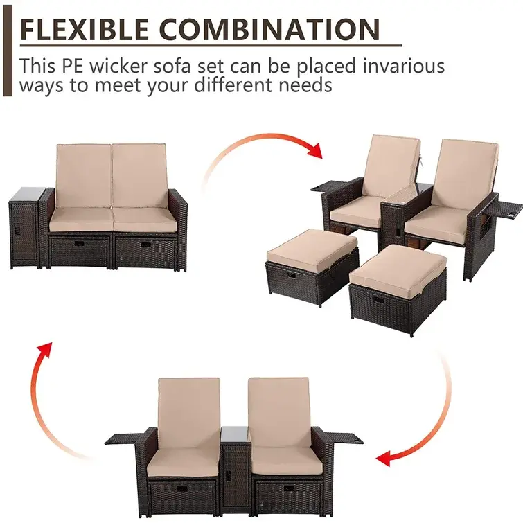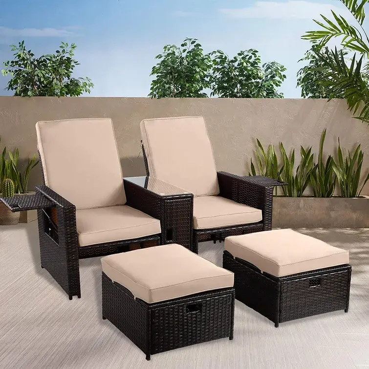 Two-seater woven rattan sofa for patio – Outdoor sofa set with cushions – Reclining armchair with footrest, wicker furniture for garden, terrace, balcony, beach, cafe, patio
