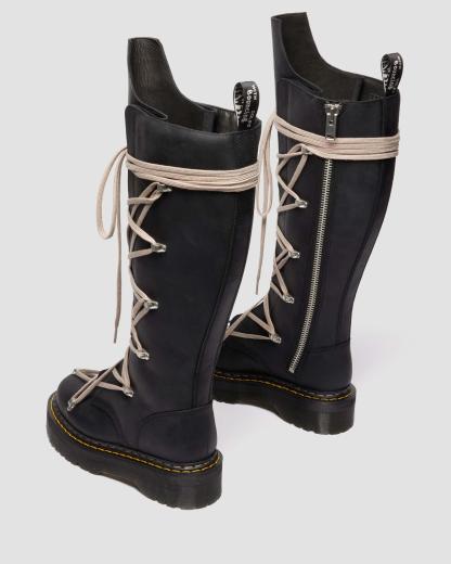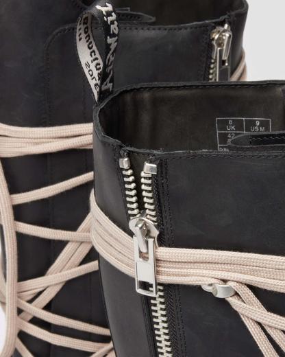 A true monolith. Our latest partnership exaggerates the already towering 1B60 silhouette. Cut from black Republic, a rich, waxy leather and featuring Rick Owen��s signature pentagram lacing with easy access side zipper. Set on the unmistakable Quad sole with and yellow and white double welt stitch. Finished with an exaggerated geometric tongue and special edition AirWair heel loop.