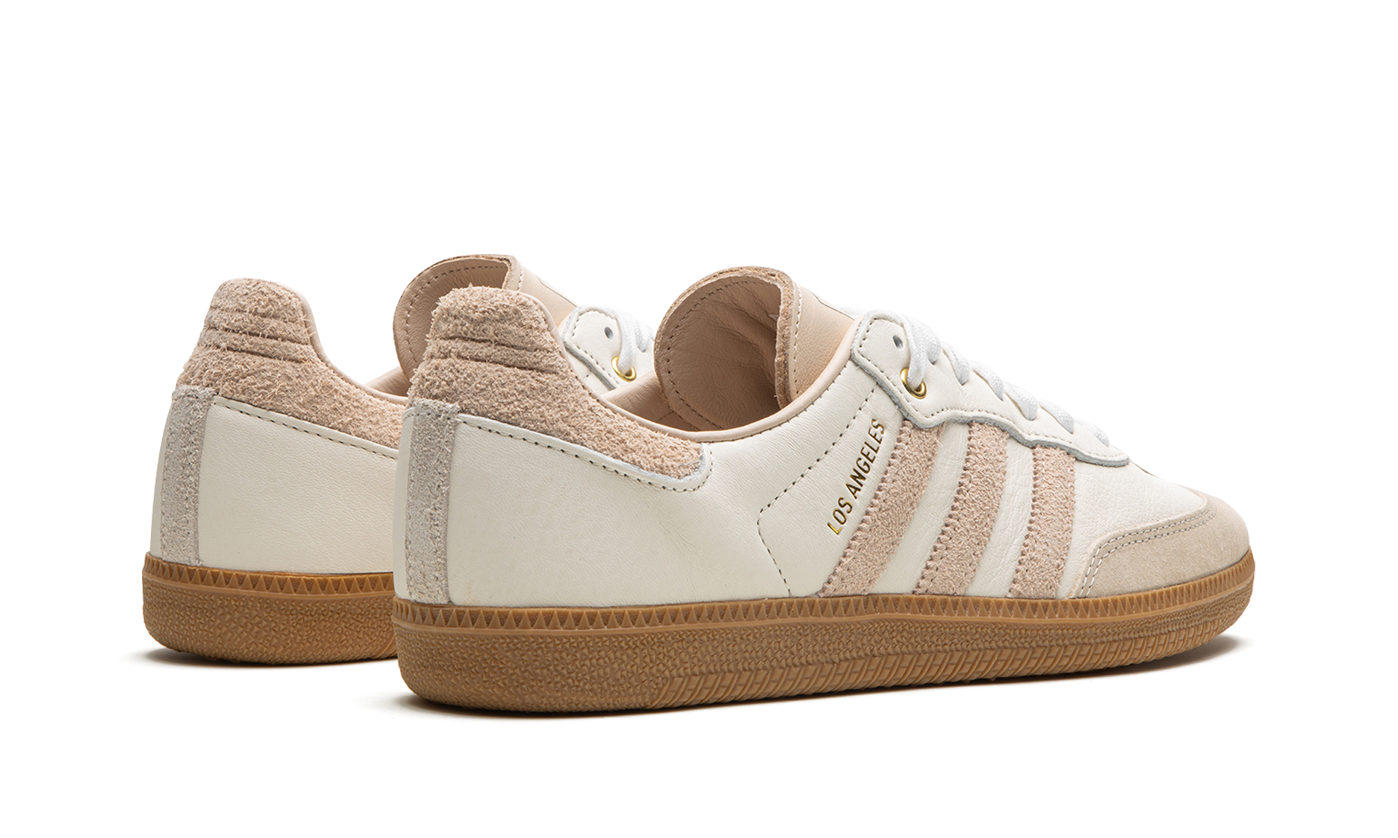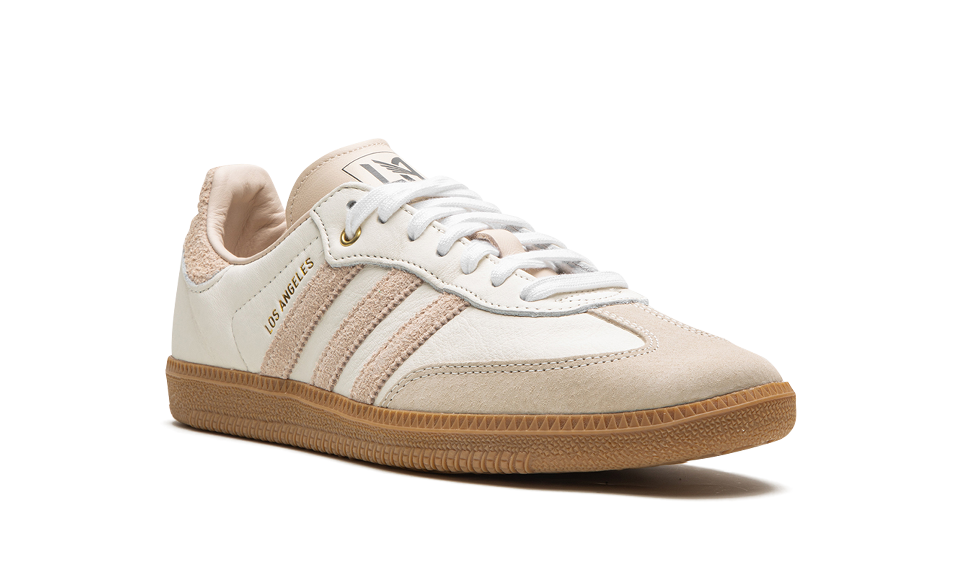 The adithtdas Samba "Los Angeles Football Club" is a colorway of the retro indoor soccer shoe that features design elements inspired by the Los Angeles Football Club. The Major League Soccer team is the source of inspiration for the sneaker, as the shoe features branding elements that salute the LAFC. The upper is complete with an off-white-colored leather base with a brown suede overlay on the toe and brown suede Three Stripes branding on the sides. "Los Angeles" appears in gold lettering on the lateral side of the mid-panel while an LAFC logo is seen on the tongue. A gum rubber cupsole completes the look. Release date: November 14, 2021 LAFC Los Angeles Football Club