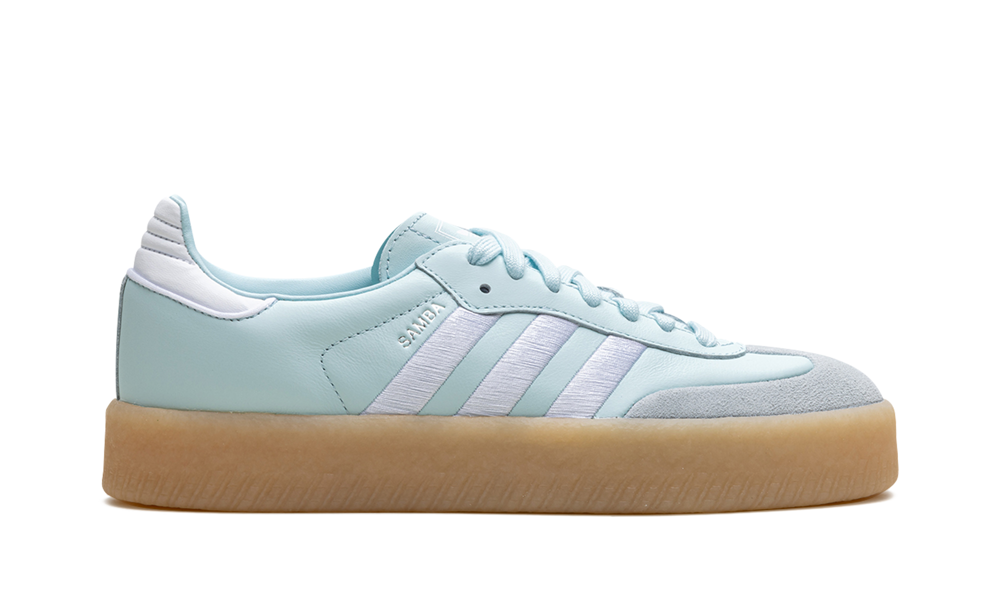 The Women's adithtdas Sambae "Almost Blue/Silver Metallic" is a women's-exclusive colorway of the version of the retro shoe with a platform sole. Based on the adithtdas Samba OG, the adithtdas Sambae features contemporary details such as a thick rubber midsole that gives the shoe a platform-style appearance. On this colorway, the upper has an Almost Blue leather construction with oversized white embroidered Three Stripes on the sides. A white leather panel appears on the heel, while classic adithtdas branding can be found on the tongue. The platform sole in gum rubber completes the look. Almost Blue Silver Metallic Gum