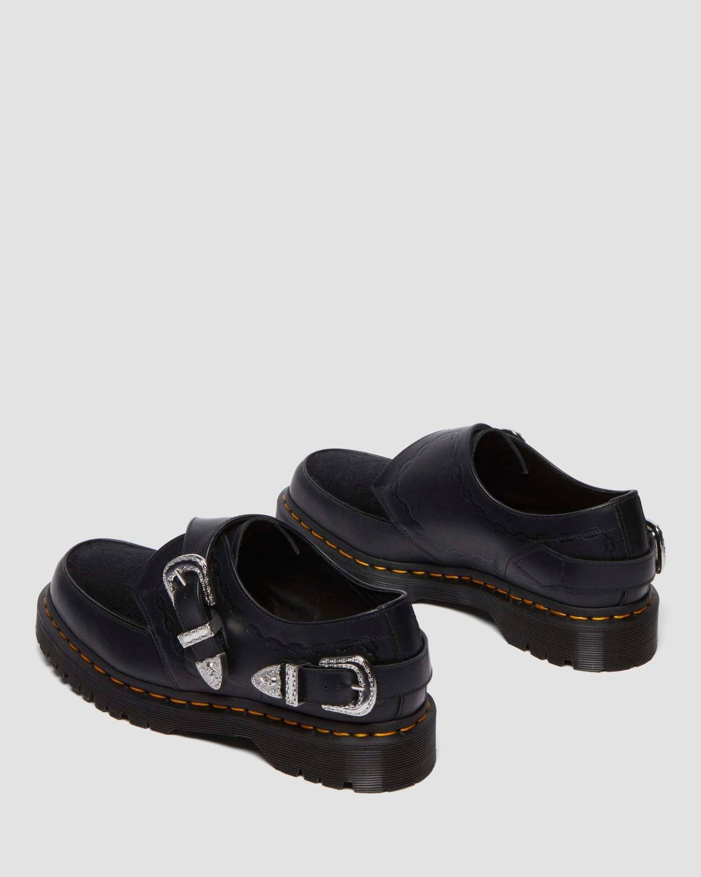 Our second collaboration with London jeweller The Great Frog includes this reworked version of our Ramsey creeper. It is made from black Smooth leather with a Hair-on vamp, with hardware engraved by TGF Creative Director Reino Lehtonen-Riley. The leather is detailed with debossed chain artwork, which also forms the border of the vintage-inspired silver buckles on the shoe��s heel and Monk strap fastening. The rugged BEN sole is punched with our yellow welt stitching, and the sock is printed with the DM��s x TGF logo.